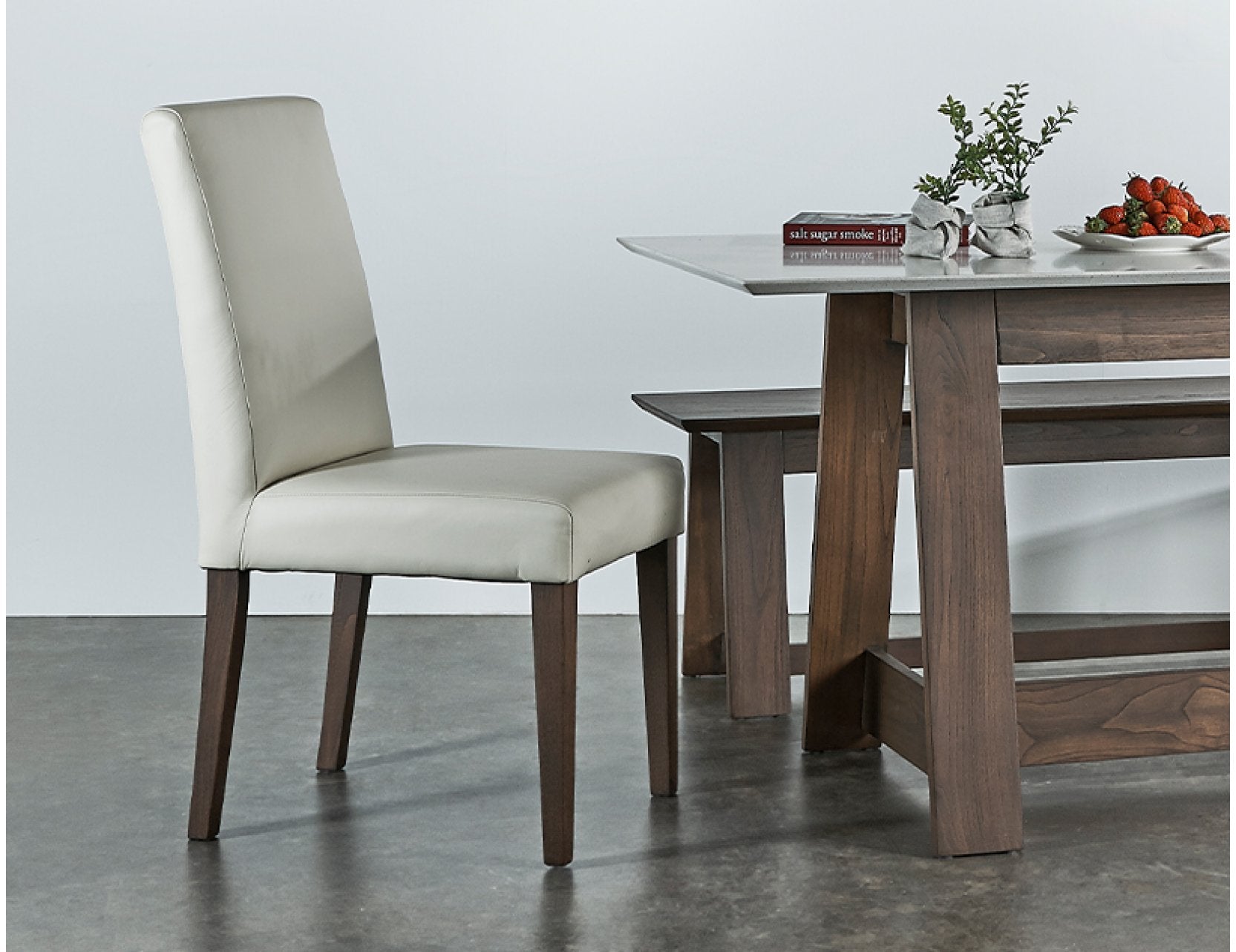The legs are made from solid sungkai wood in a warm walnut finish, adding a natural, grounded look to your home. Its slim profile fits neatly into both apartments and larger homes, making it a versatile choice for any dining setup.