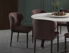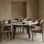 The Kay Round Dining Table features a durable sintered stone top with a marble-like finish for lasting elegance. It includes an optional Lazy Susan for convenient sharing. Supported by sturdy metal legs, this table combines strength and style to enhance your dining experience.