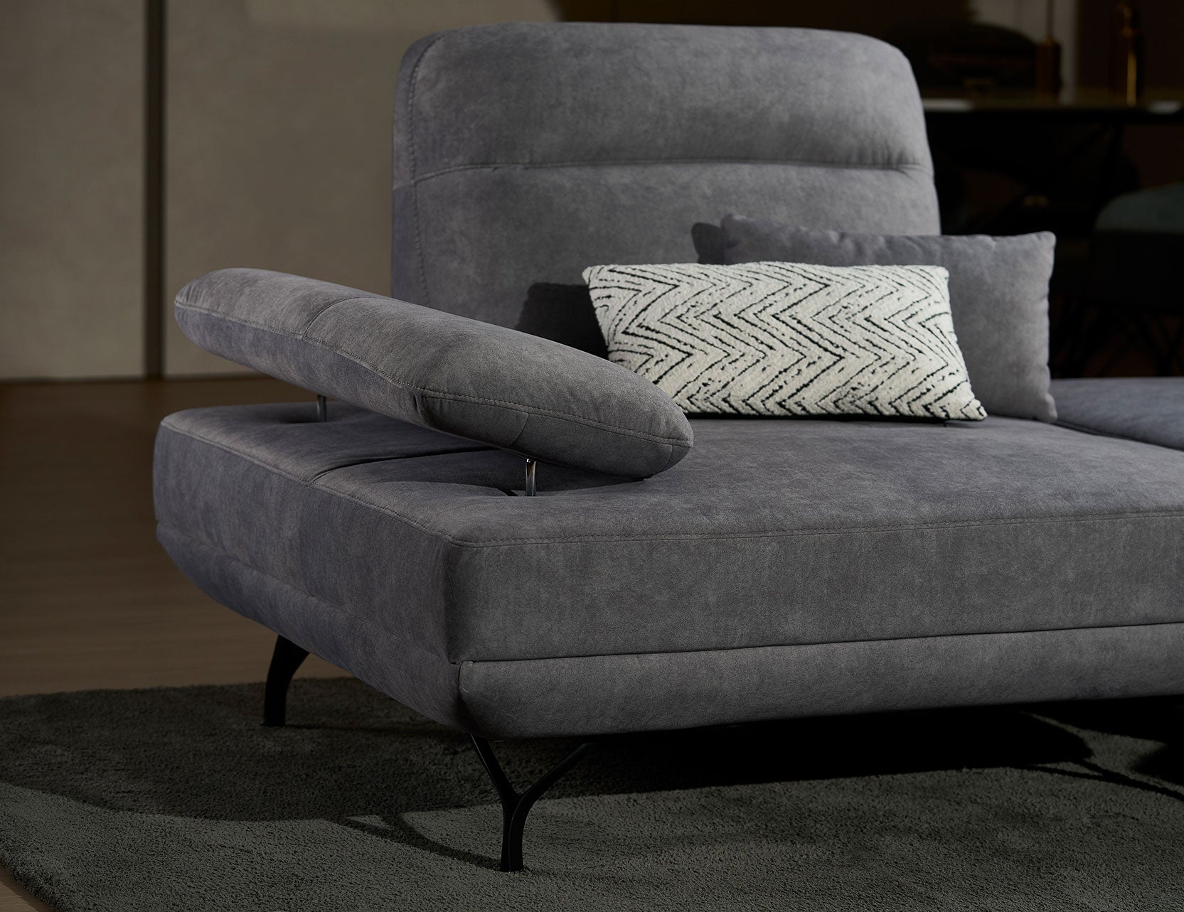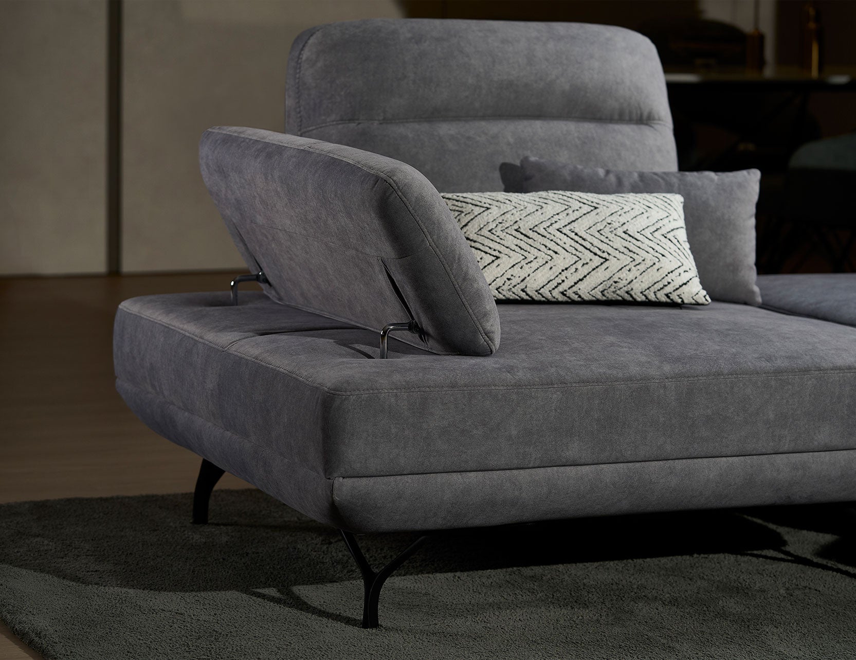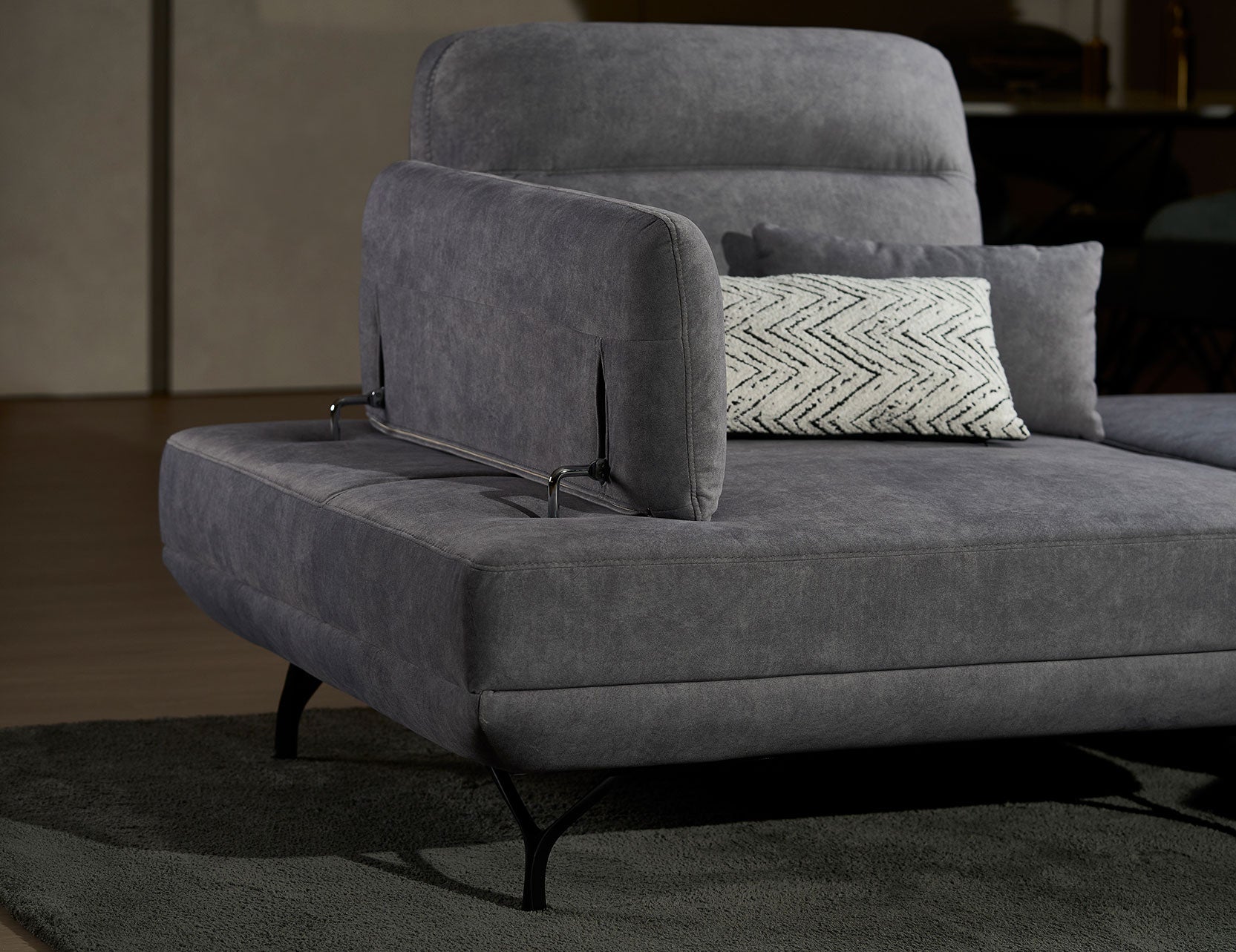 The standout feature is its manually adjustable push-back backrest mechanism, which lets you customise your seat depth from a regular position to a more relaxed, deeper setting. With a convenient strap for easy adjustments and armrests that can be angled for optimal arm support or used as a cosy pillow for napping, this sofa is as versatile as it is stylish.