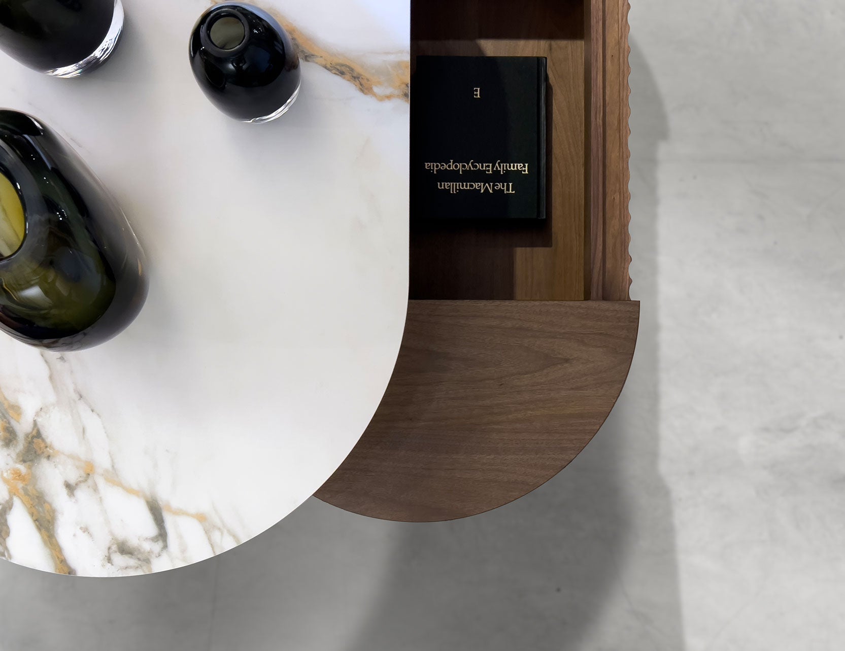 The Fluto Convertible Coffee Table is the perfect blend of style and functionality for modern living spaces. With its sleek sintered stone top in ‘Nazzo’ and warm walnut veneer, this pill-shaped table brings a trendy, sophisticated vibe to any room. The black steel legs, finished in a matte textured powder coat, provide a sturdy base that complements the mix of materials beautifully.