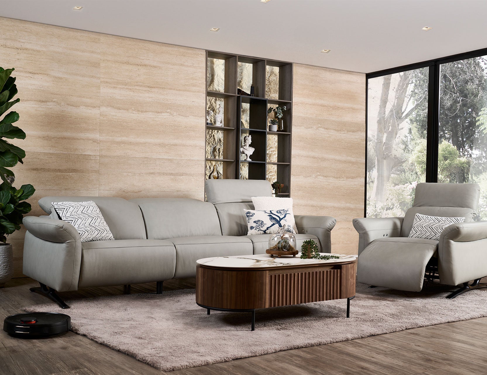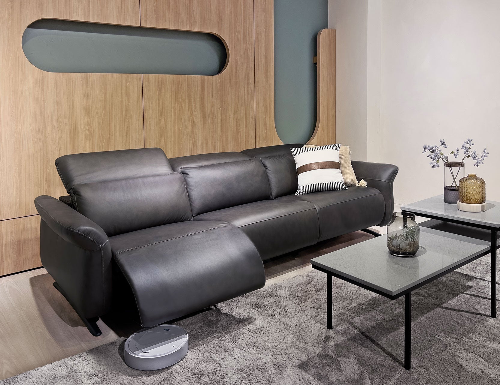 A luxurious contemporary sofa designed for modern living, Viso has the visual appeal of a leather couch and the functionality of a motorised sofa. Its high-leg mechanism is cast in aluminium and provides ample space between the floor and the bottom of the sofa, making cleaning a breeze for robot vacuums.