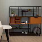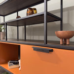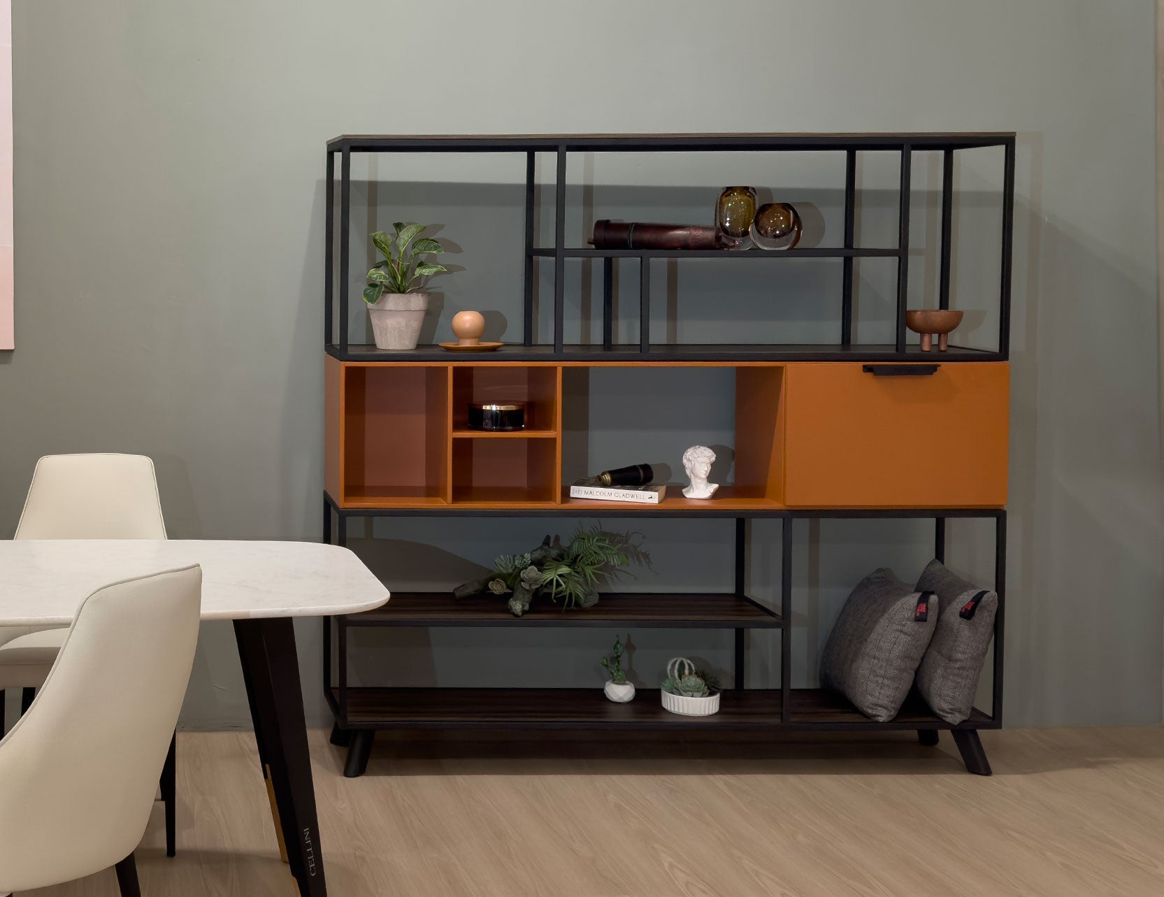 Meet the NERO 56 Display Cabinet—a piece that effortlessly combines modern design with a touch of vibrant flair. Crafted from MFM Frapp Walnut and featuring a striking contrast of brick-coloured MDF panels against a sleek black steel frame, this cabinet brings a bold, graphic element to any space.