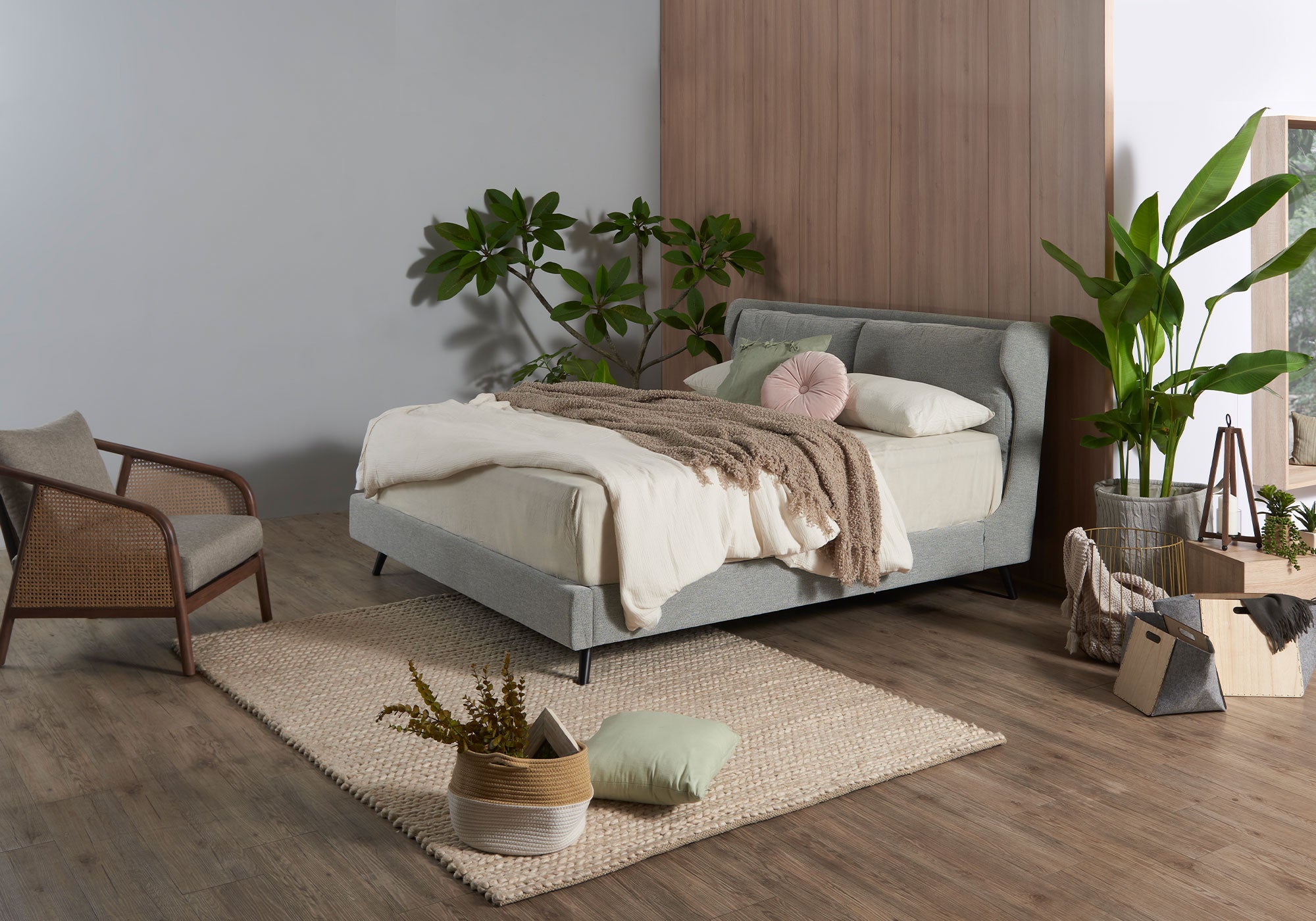 • Soft fabric upholstery for a clean, modern bedroom look