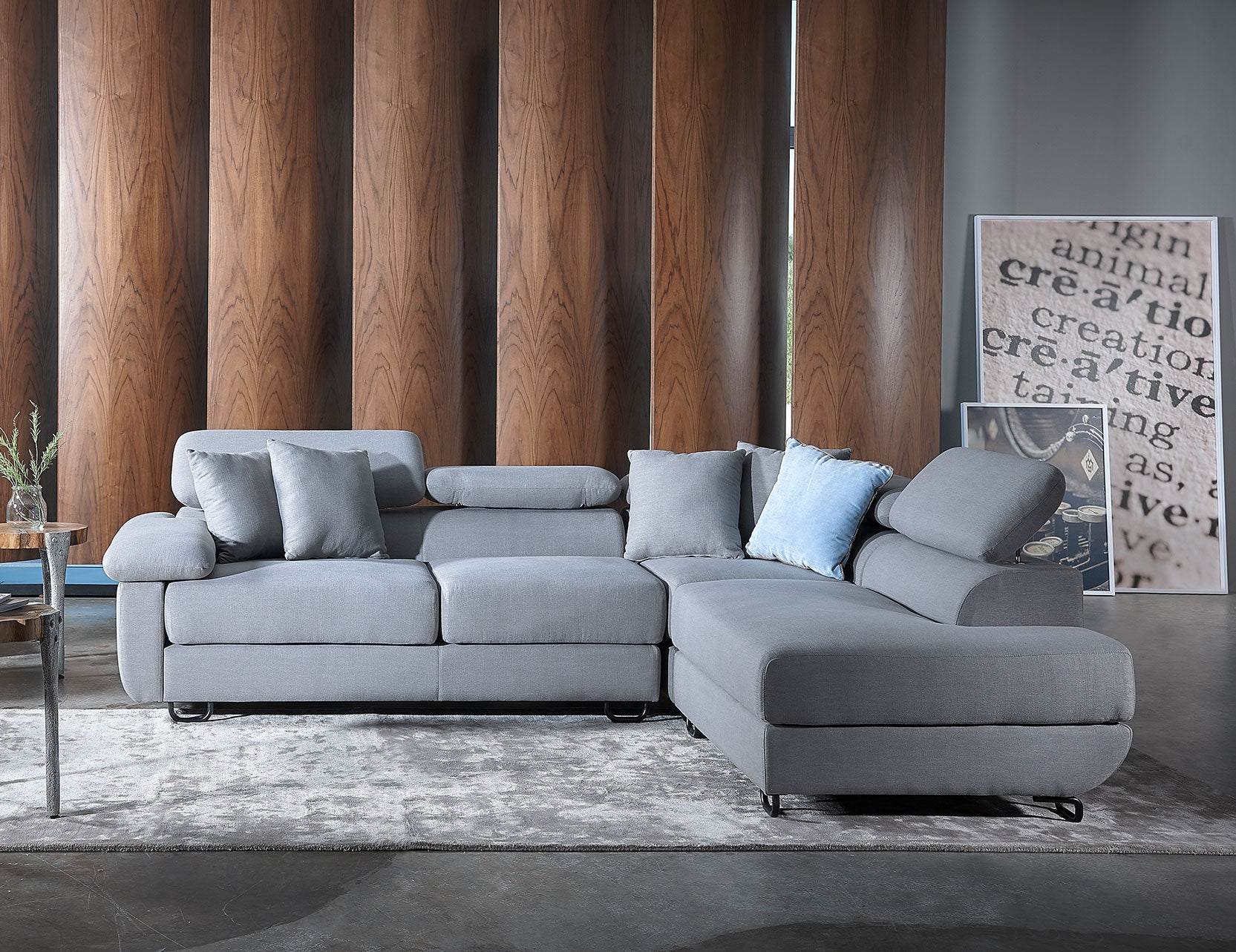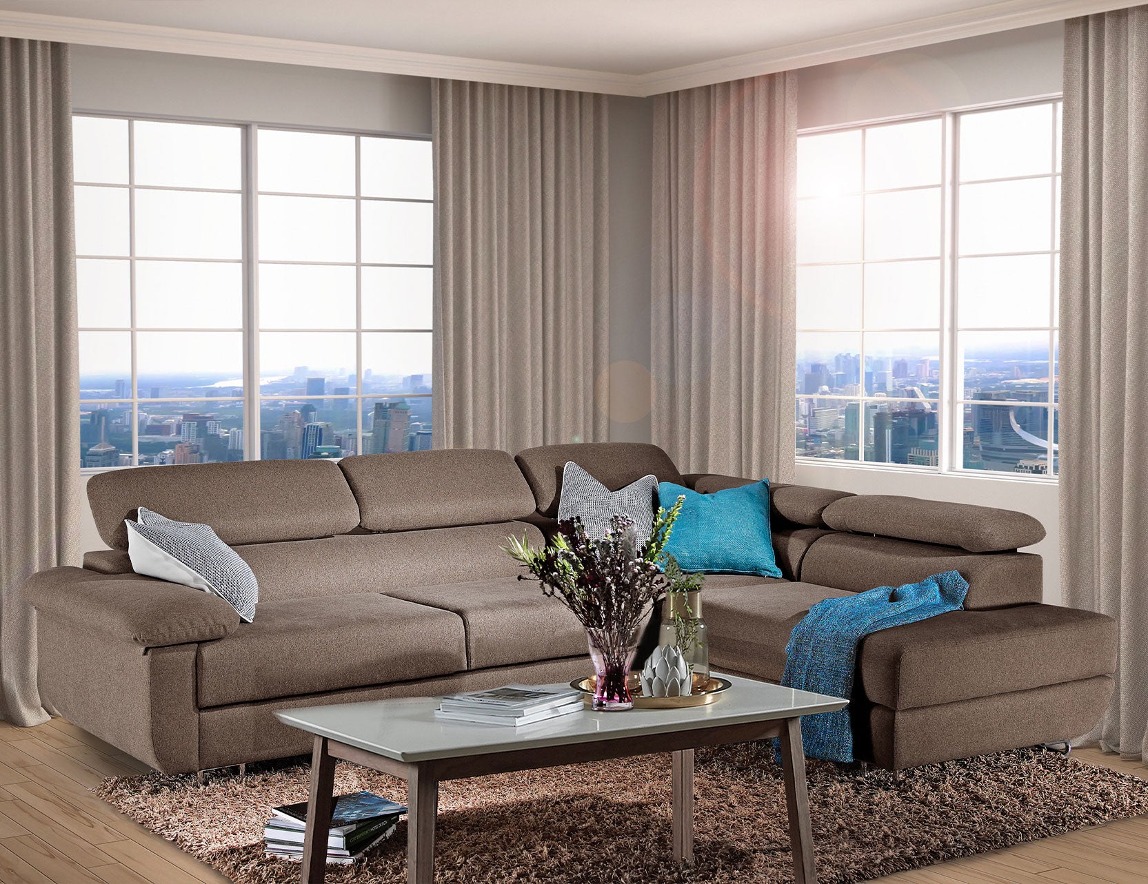 Apollo L-shape fabric sofa is a sleek and contemporary low back seating sofa. It's beauty comes from the sofa curves of this piece. A sectional sofa with it's modular configurations. It has adjustable headrests that hide away and keep the profile minimal. A firm piece, upholstered in fabric, made for medium to large living spaces. Apollo is available in L-Shape, sectional configuration or 4 seater and 3 seater options.