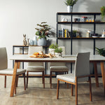 The BOLDA Dining Table is made to stand out with its bold shape and smart use of materials. The top is crafted from hard-wearing quartz stone in Bianca or Grigio finishes, giving you a sleek surface that’s strong, beautiful, and easy to keep clean.