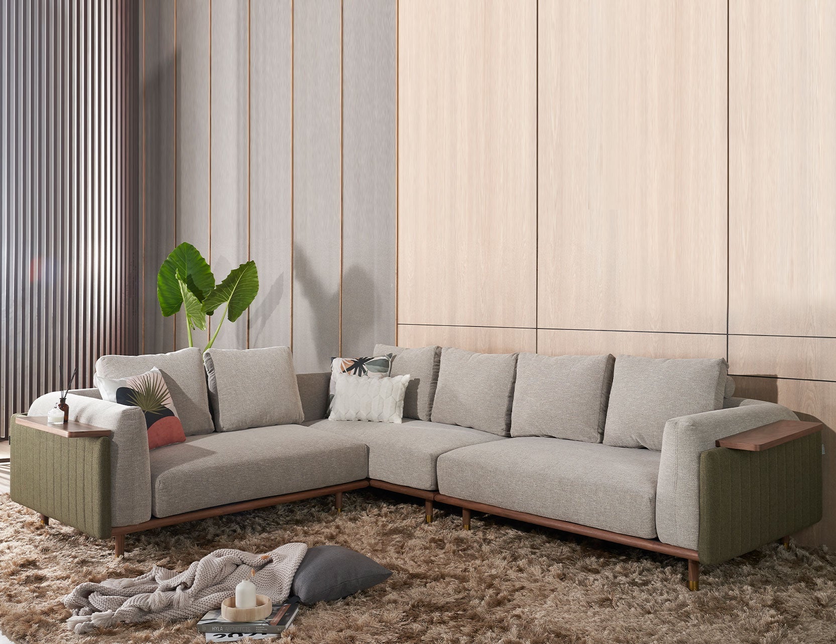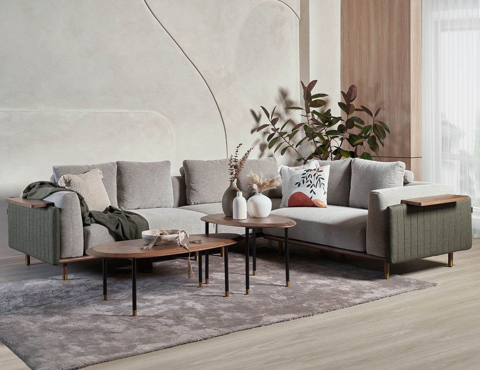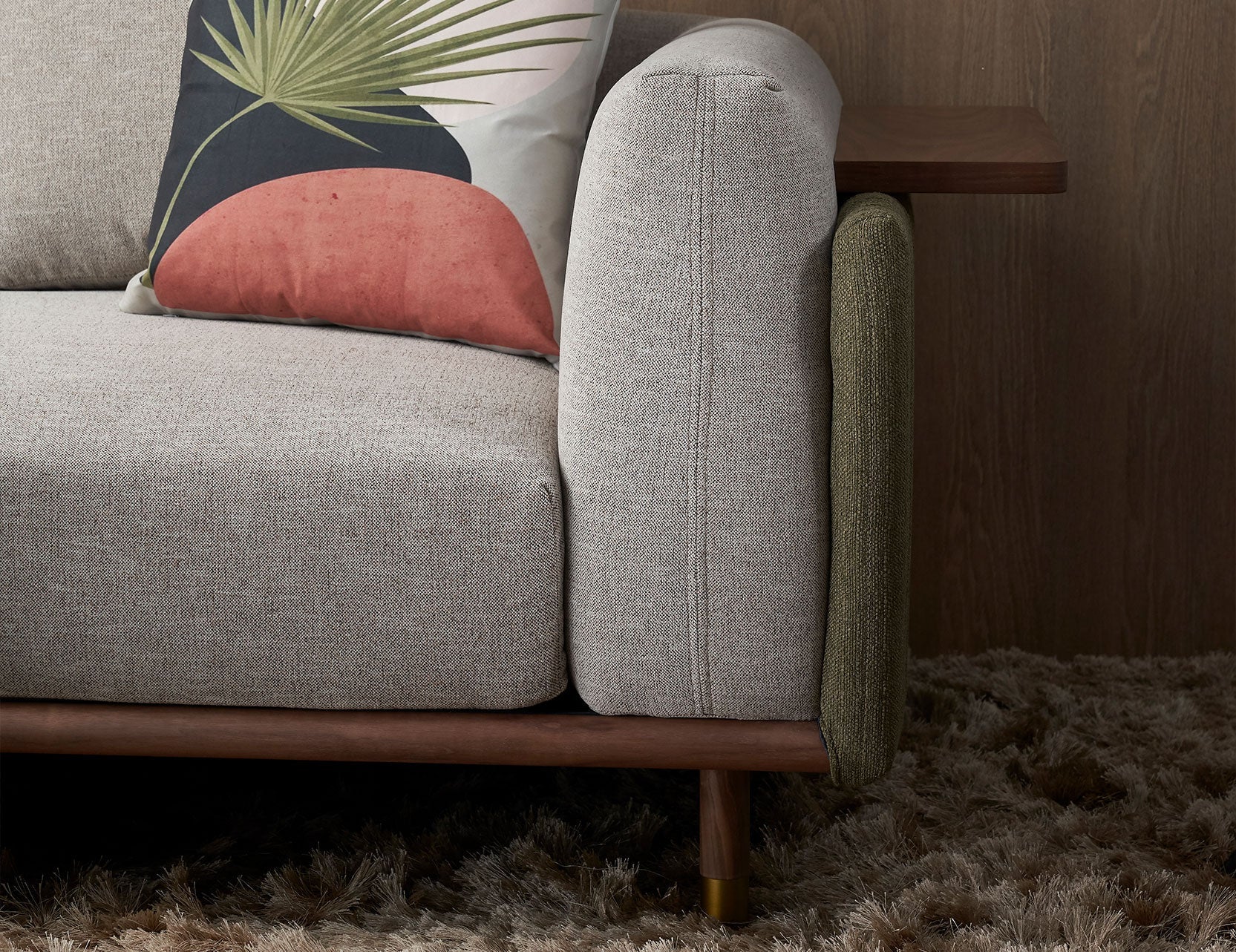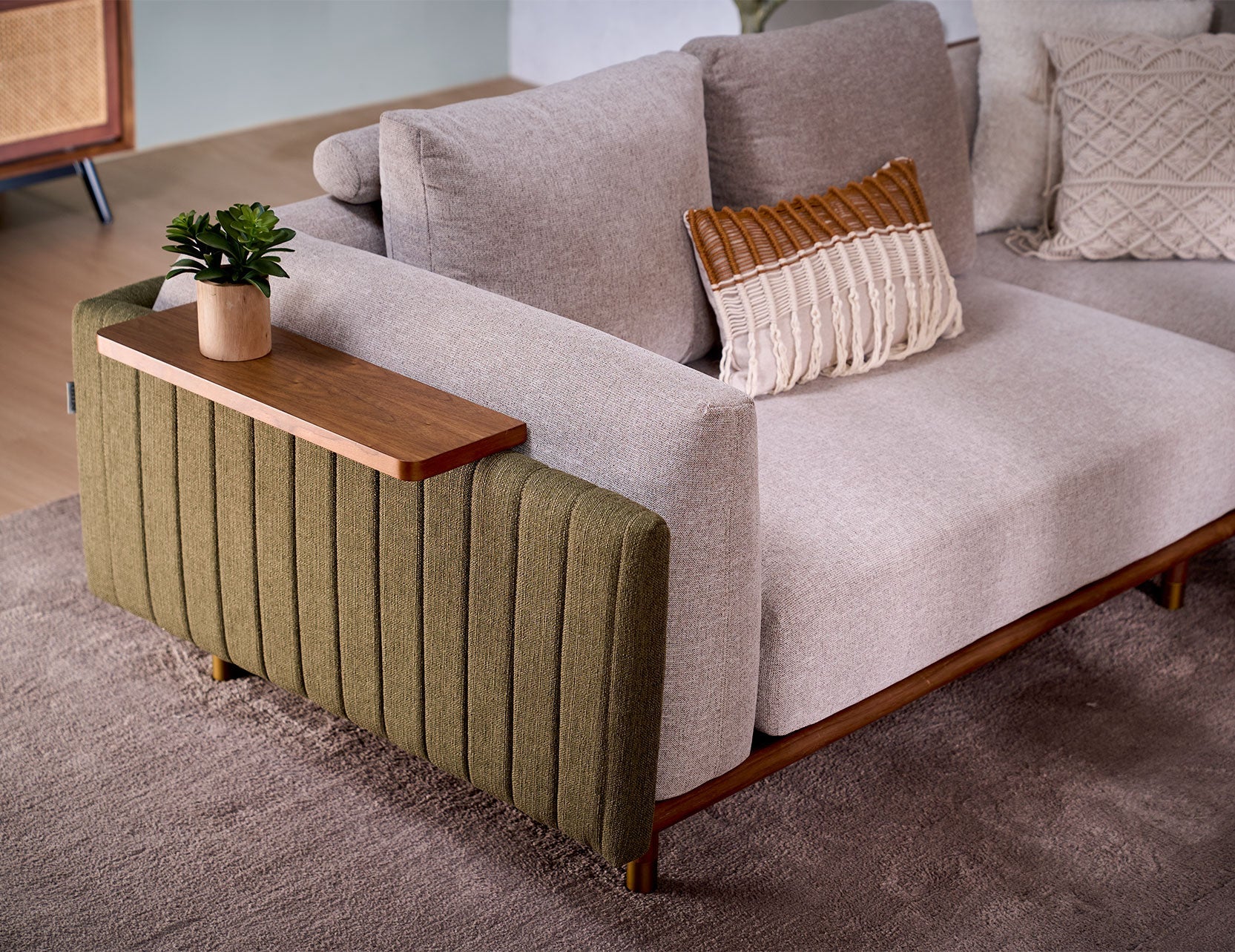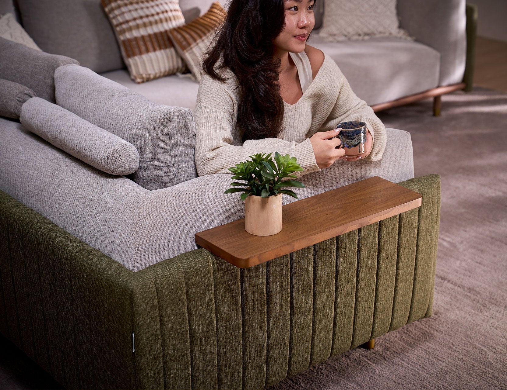 Celadon, a modular fabric sofa that embraces your body wherever you sit, suiting your lounging needs. It is well-equipped with a slim side table designed to slot flawlessly into the side or back padding of the sofa. Celadon features a clean, contemporary style that sits on a steel laminated metal base with natural American walnut veneer and gold-tipped legs, revealing its subtle vintage vibes.