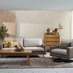 Dansk is a quirky little living room set made up of 3 seater + 1 seater fabric sofa in a living room package. The tapered legs of the Dansk sofa give it a light, airy feeling of seamlessness - it is made for small sized living rooms or studio apartments. In a classic Scandinavian look with a mix of both fabric and synthetic upholstery, this sofa also has the added benefit of having removable seat and back cushions. The DANSK collection also includes a tv console, coffee tables, side board, display shelves, a writing desk and side tables.