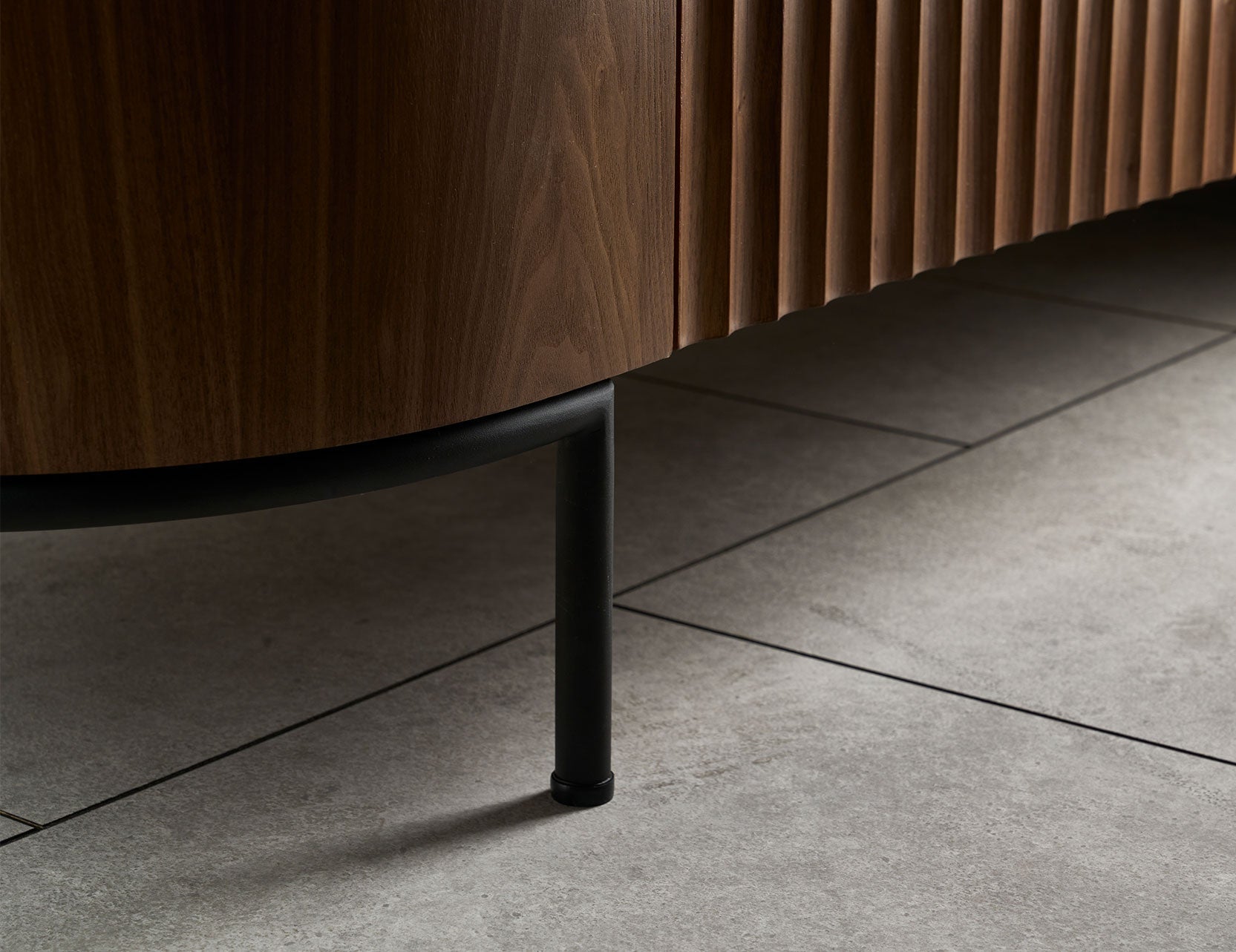 The pill-shaped form and trendy fluted panels on the front give it a chic, contemporary edge, while the sturdy steel legs with a black textured powder coat finish ensure lasting durability.