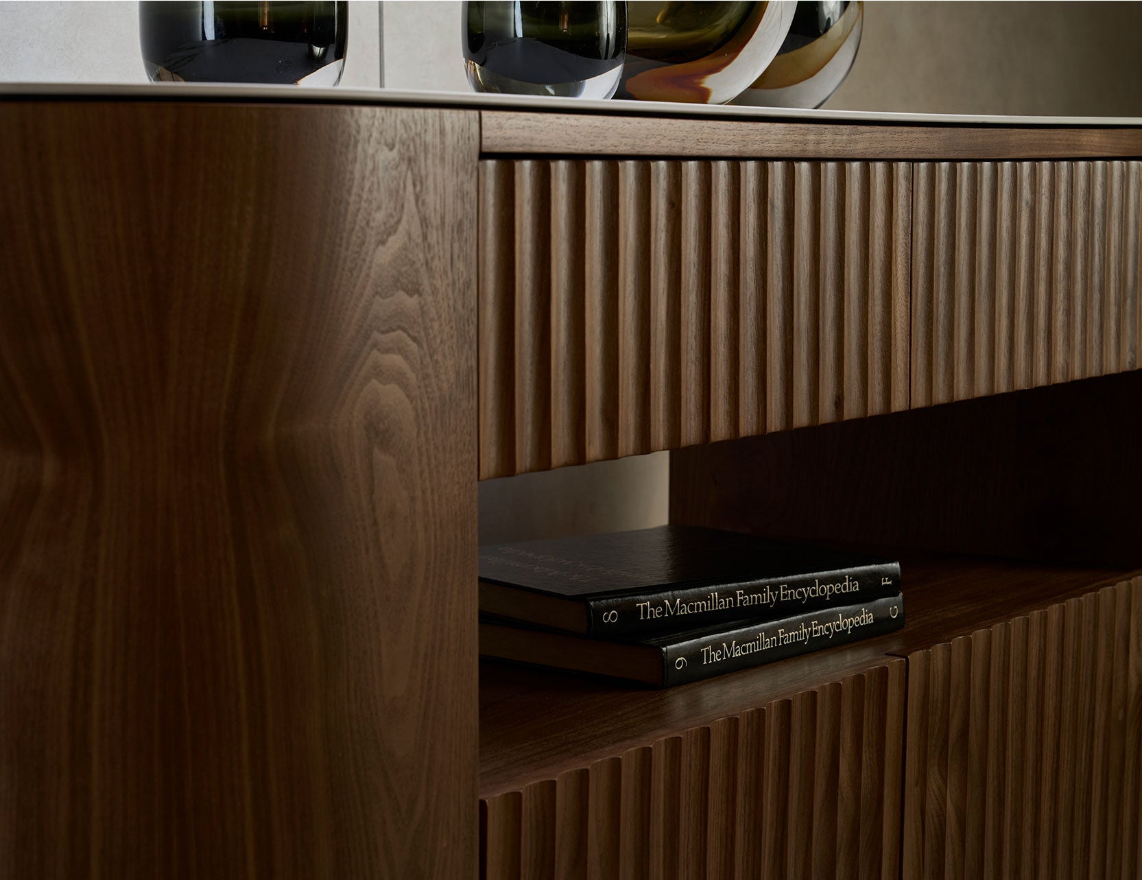 The Fluto Sideboard is where style meets practicality, perfect for elevating your living space with a touch of modern elegance. Its sleek sintered stone top in ‘Nazzo’ pairs beautifully with the warm walnut veneer, creating a harmonious blend of textures and tones.
